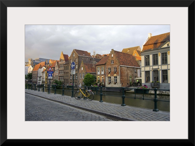 <p>Europe, Belgium, Ghent. A bicycle parked on a paved-stone sidewalk by the water, and historic Ghent architecture.</p>
