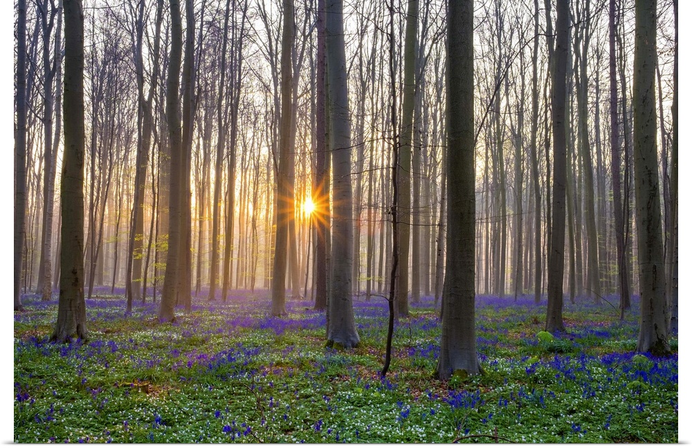 <p>Belgium, Vlaanderen (Flanders), Halle. Bluebell flowers (Hyacinthoides non-scripta) carpet hardwood beech forest in early spring in the Hallerbos forest at sunrise.</p>