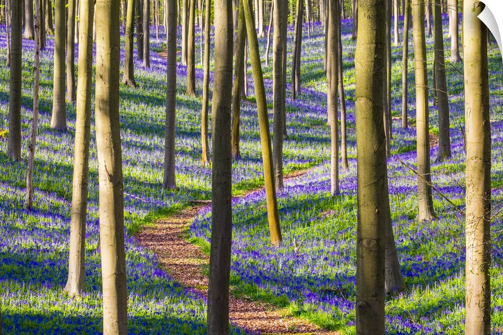 <p>Belgium, Vlaanderen (Flanders), Halle. Bluebell flowers (Hyacinthoides non-scripta) carpet hardwood beech forest in early spring in the Hallerbos forest.</p>