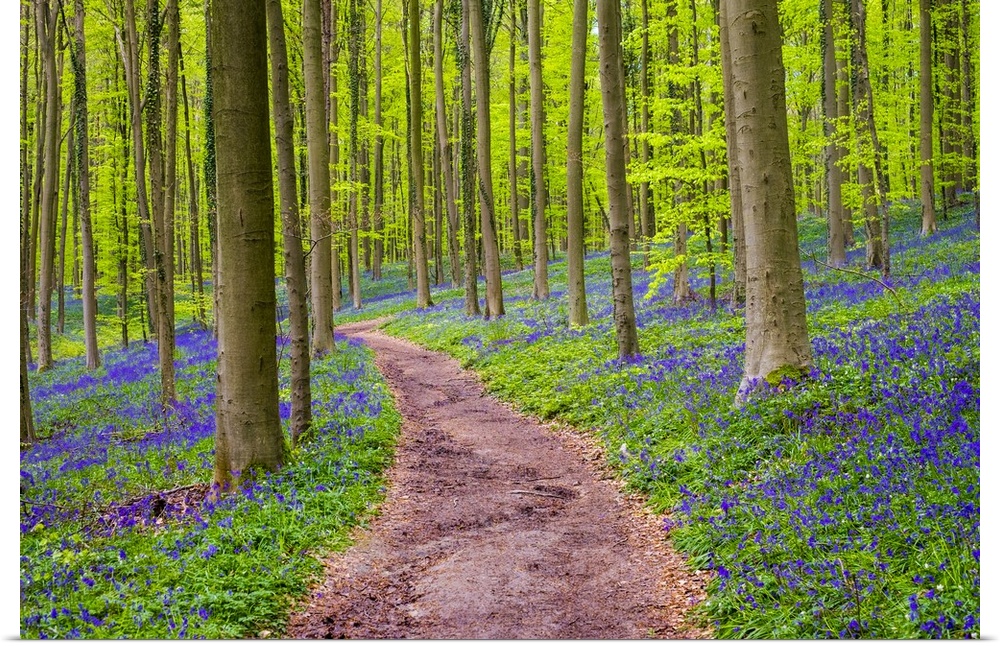 <p>Belgium, Vlaanderen (Flanders), Halle. Bluebell flowers (Hyacinthoides non-scripta) carpet hardwood beech forest in early spring in the Hallerbos forest.</p>
