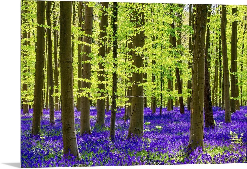 <p>Belgium, Vlaanderen (Flanders), Halle. Bluebell flowers (Hyacinthoides non-scripta) carpet hardwood beech forest in early spring in the Hallerbos forest.</p>