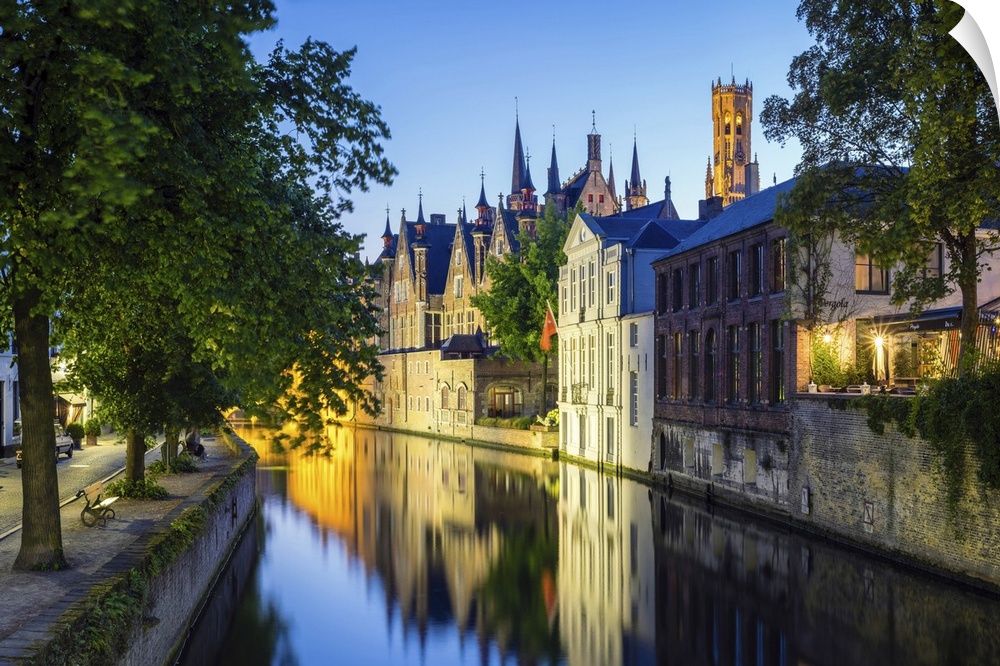 <p>Belgium, West Flanders (Vlaanderen), Bruges (Brugge). Buildings along the Groenerei canal at dusk.</p>