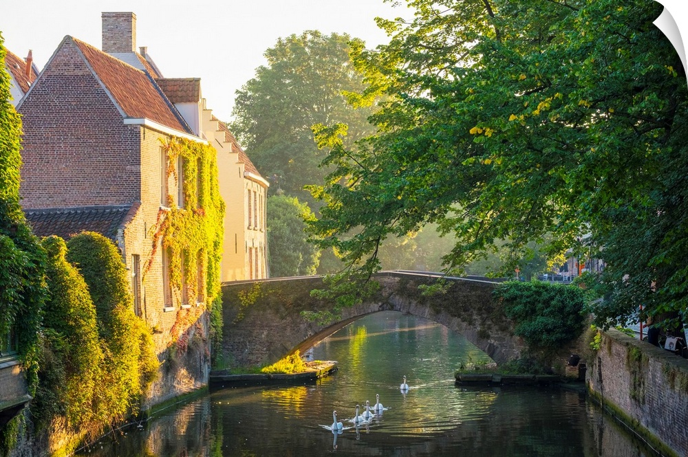 <p>Belgium, West Flanders (Vlaanderen), Bruges (Brugge). Buildings along the Groenerei canal at dawn.</p>