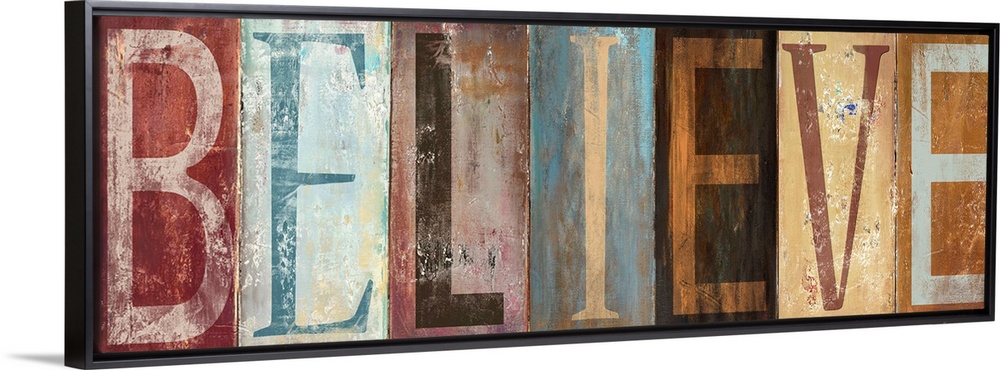 <p>The word "Believe" with each letter painted in a different style in muted colors, with a worn, weathered look.</p>