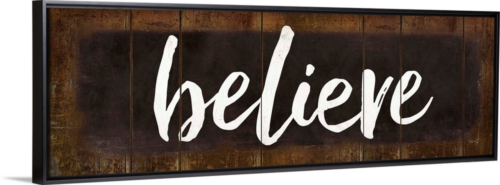 <p>"Believe" in white handlettered script on a weathered brown background.</p>