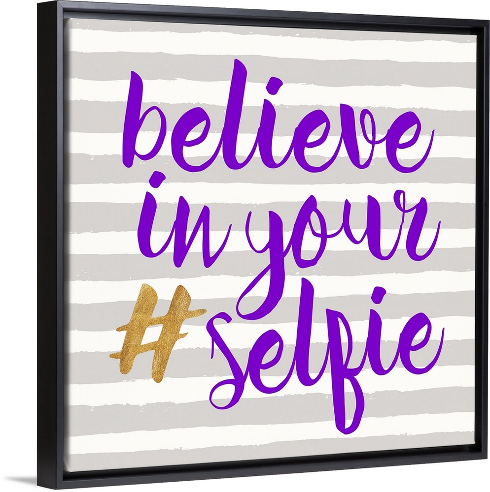<p>"Believe in Your (hashtag) Selfie" written in purple and gold on a gray and white striped background.</p>