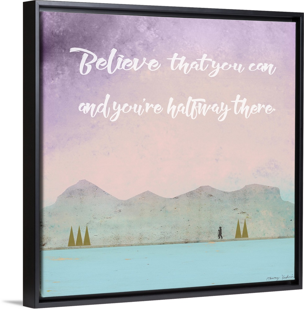 <p>"Believe That You Can And You're Halfway There" in white above a nature scene of a hiker among mountains.</p>