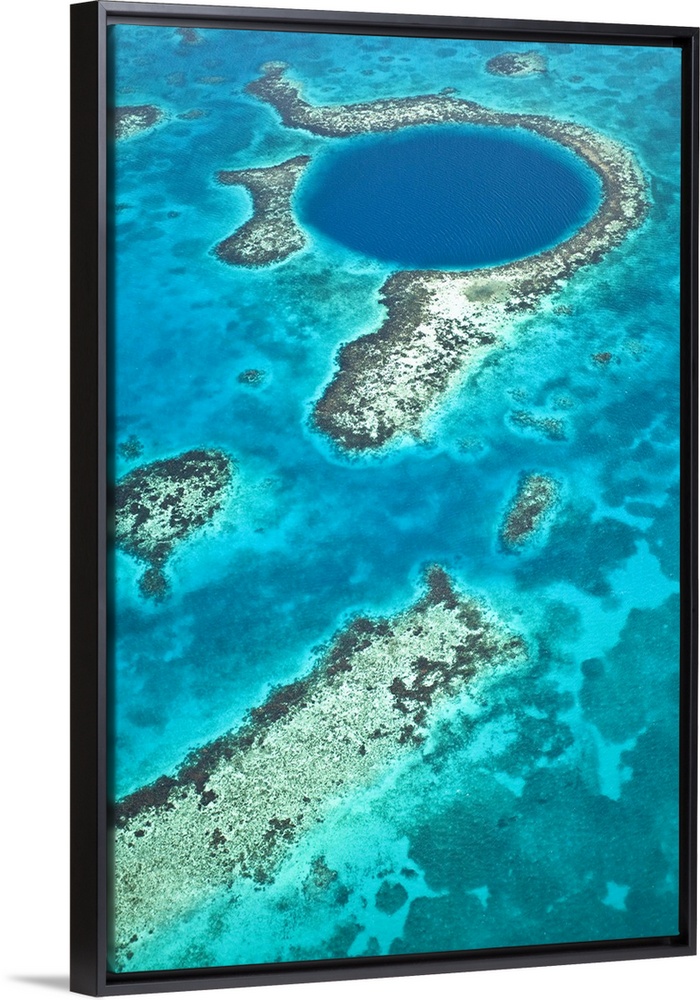 <p>Central America, Belize, Lighthouse atoll, the Great Blue Hole, aerial shot of the Blue Hole. The hole is a marine cenote - a sunken cave in the Lighthouse atoll, part of the World Heritage listed Belize Barrier Reef System</p>