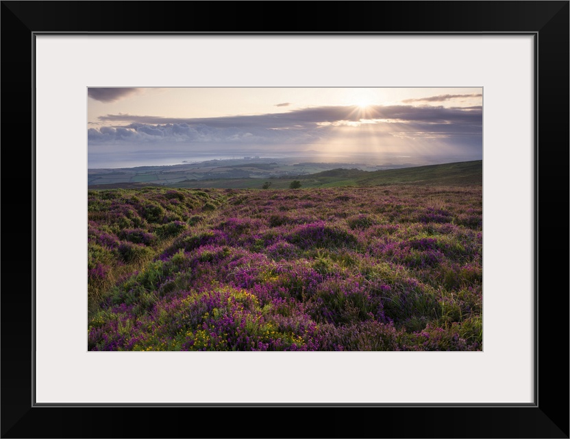 <p>Bell heather at sunrise on Longstone Hill in the Quantock Hills Area of Outstanding Natural Beauty with the Bristol Channel beyond.</p>