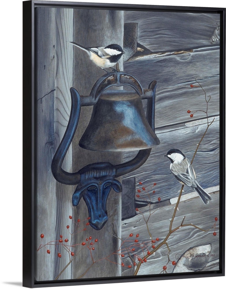 <p>Two black capped chickadees; one perched on a bell and the other on a lower branch</p>