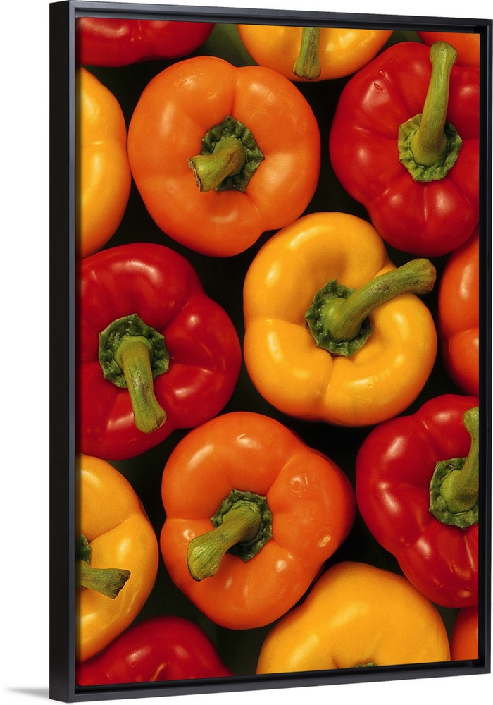 <p>Overhead shot of a group of three varieties of freshly picked bell peppers in summer colors.</p>