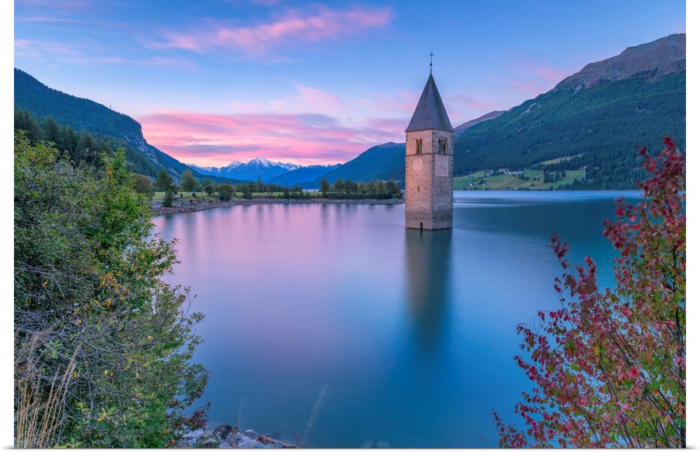 <p>Bell tower submerged of Resia lake at sunrise-Europe, Italy, Trentino Alto Adige, South Tyrol, Curon Venosta.</p>