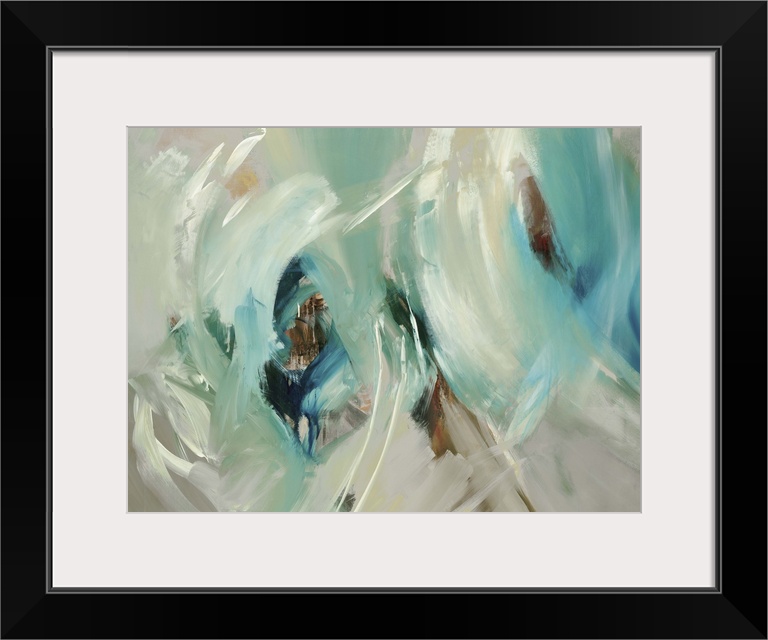 <p>Contemporary abstract painting using vibrant blue green tones with neutral colors in circular movements.</p>