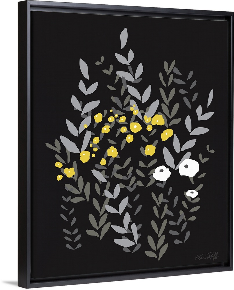 <p>Large graphic illustration of abstract wildflowers in yellow, white, and gray hues on a solid black background.</p>