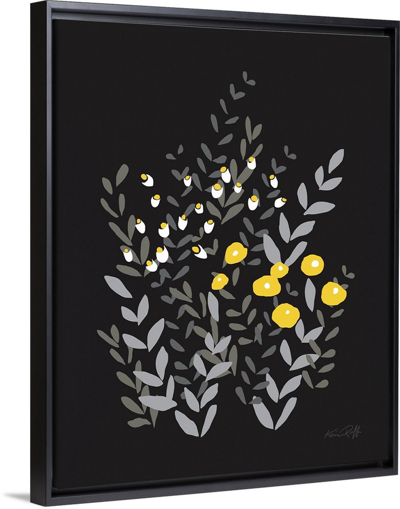 <p>Large graphic illustration of abstract wildflowers in yellow, white, and gray hues on a solid black background.</p>
