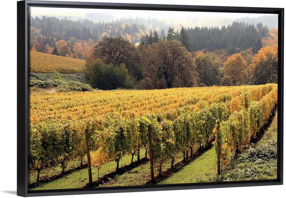 <p>Large canvas print of a vineyard with a fall foliage covered forest in the background.</p>