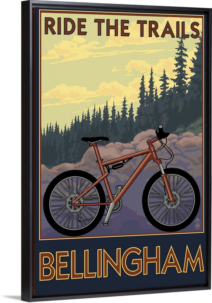 <p>Retro stylized art poster of a mountain bike, with a dense forest in the background.</p>