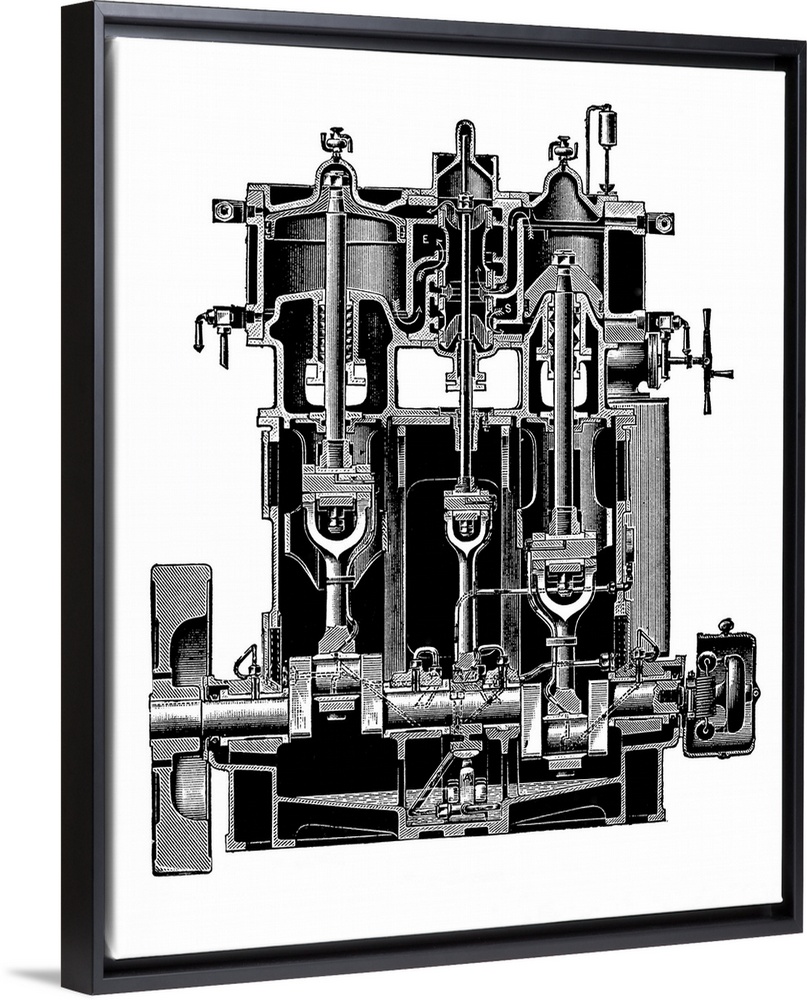<p>Bellis and Morcom steam engine. Cutaway artwork of a front-section through a double-acting steam engine. This design was developed in the 1890s by the British engineers Bellis and Morcom. They used forced lubrication under pressure to prevent the engine seizing up. The cutaway artwork shows the two main pistons at right and left (vertical), with the crankshaft across bottom. The flywheel is at lower left. At lower centre is the forced lubrication oil pump that supplied oil to both pistons.</p>