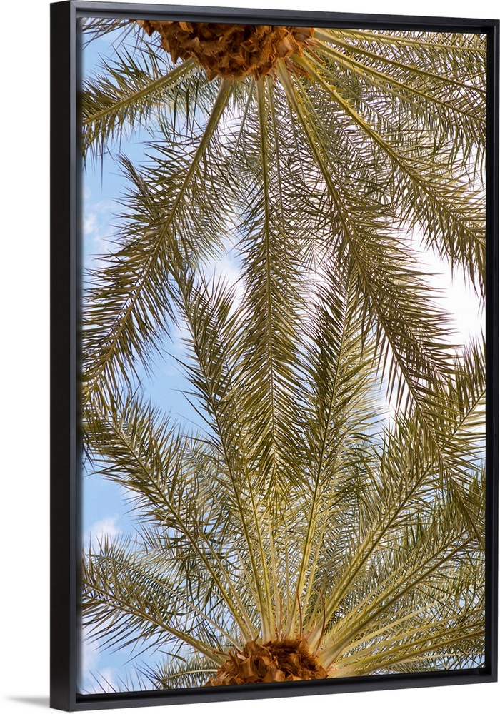 <p>Photograph looking up at the very tops of two palm trees with a blue sky and white clouds in the background.</p>