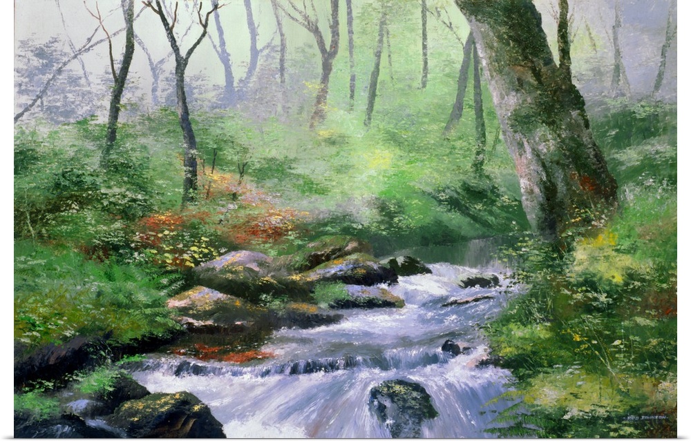 <p>Contemporary painting of a stream moving through a forest.</p>