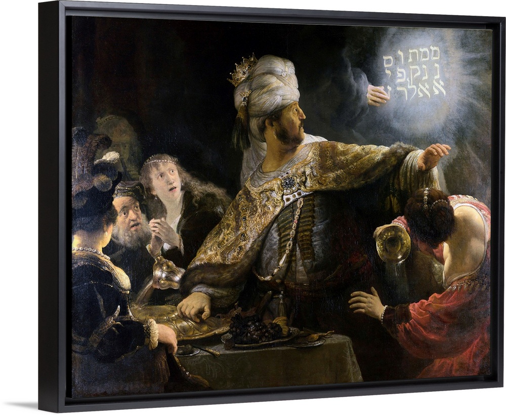 <p>Circa 1636-1638, oil on canvas, 167.6 x 209.2 cm, National Gallery, London, England. From the Bible, Book of Daniel 5:1-31, where King Belshazzar of Babylon steals treasures from the Jewish Temple in Jerusalem, after which he uses them to worship heathen gods. The spirit descends in the form of a hand and writes words on the palace wall spelling Belshazzar's doom.</p>