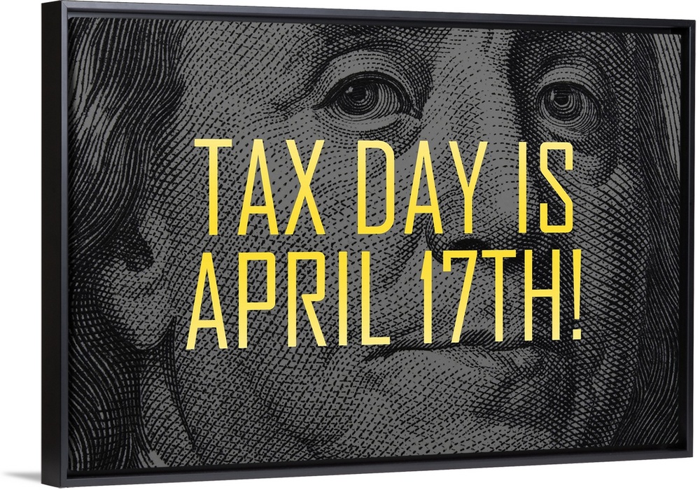 <p>"Tax Day Is April 17th!" written in yellow on top of Ben Franklin's face from the one hundred dollar bill.</p>