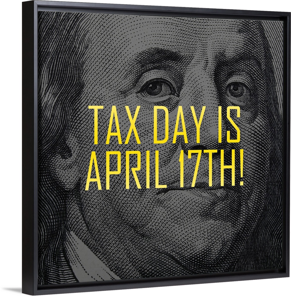 <p>"Tax Day Is April 17th!" written in yellow on top of Ben Franklin's face from the one hundred dollar bill.</p>