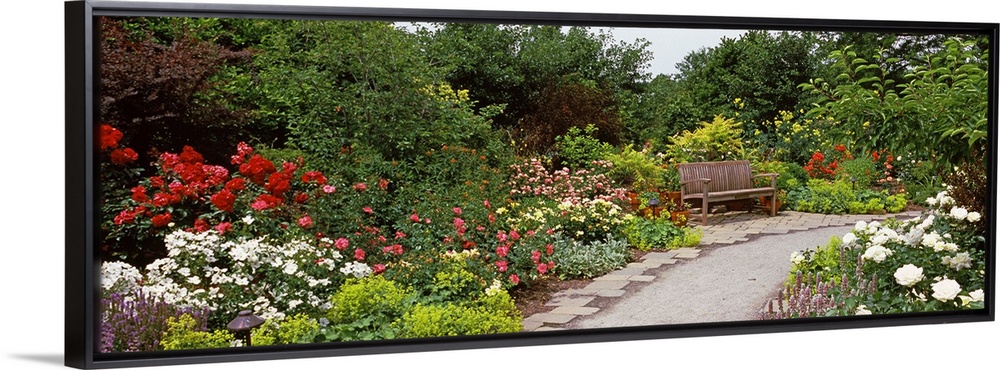 <p>Landscape, oversized photograph of a stone path leading toward a wooden bench as it curves through flowers and foliage of the Olbrich Botanical Gardens in Madison, Wisconsin.</p>