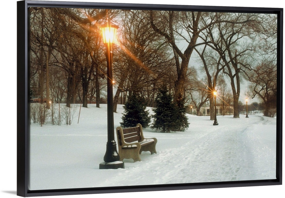 <p>Bench with streetlamp near snow-covered road, Lake Como Park, Saint Paul, Minnesota, USA</p>