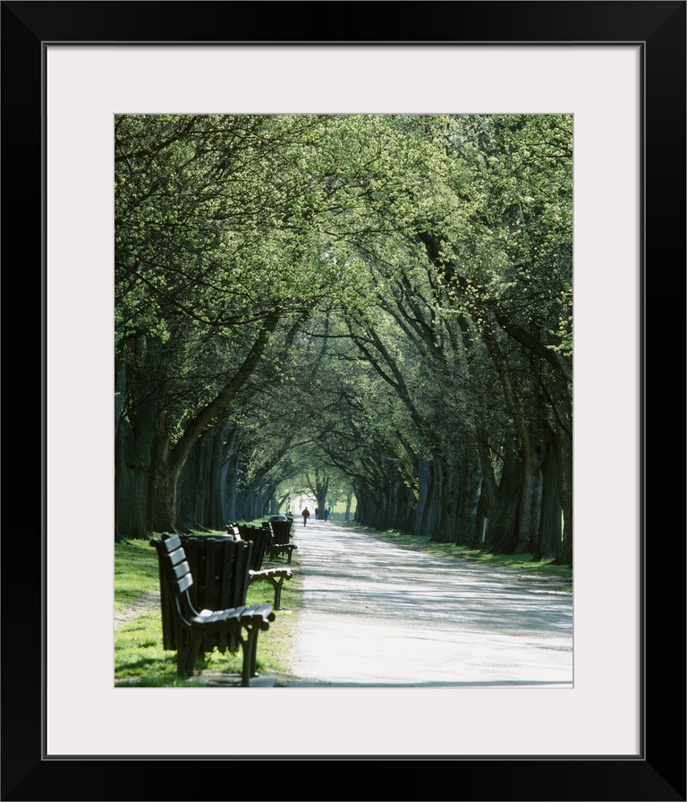 <p>Vertical photograph on a big canvas of a paved walkway lined with benches and trash cans, large trees lines both sides of the path, creating a canopy above.</p>
