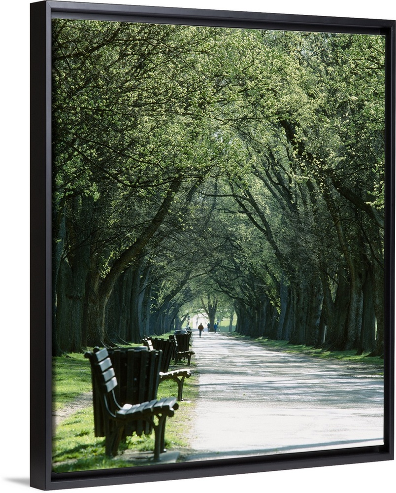 <p>Vertical photograph on a big canvas of a paved walkway lined with benches and trash cans, large trees lines both sides of the path, creating a canopy above.</p>