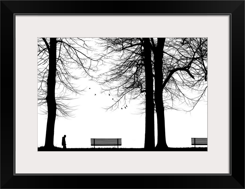 <p>A park scene with trees benches and a person cast in silhouette.</p>