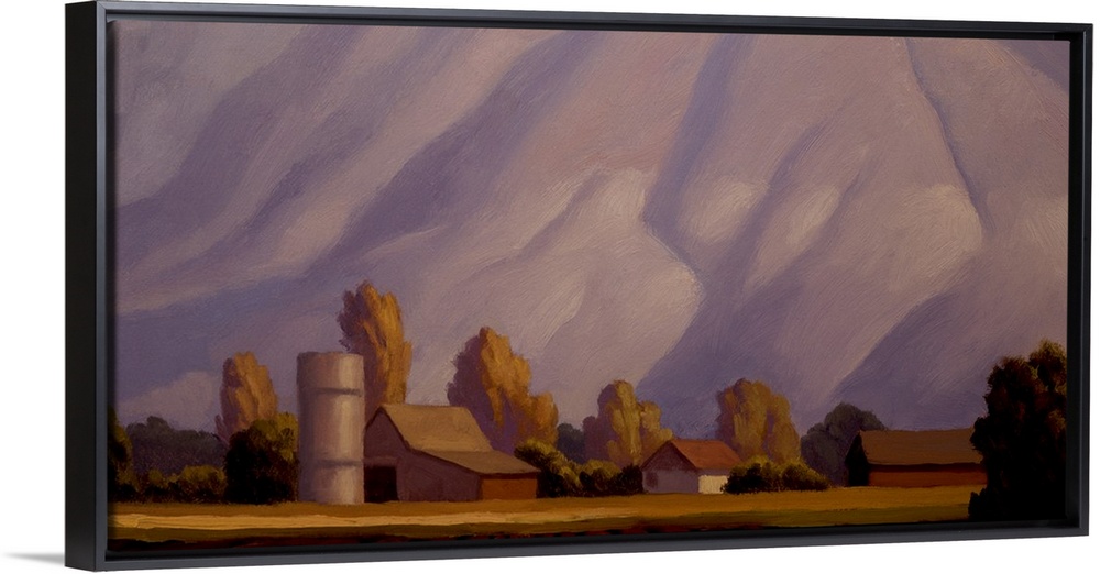 <p>Landscape painting of a farm with mountains in the background.</p>