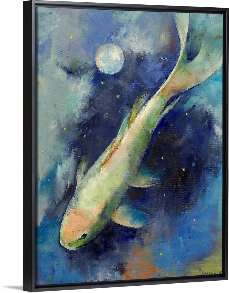 <p>Big canvas painting of a fish swimming with a reflection of the moon on the surface of the water.</p>