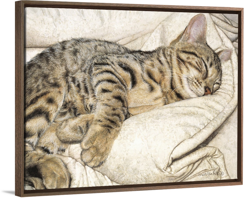 <p>A striped bengal cat enjoying a nap on a soft blanket.</p>