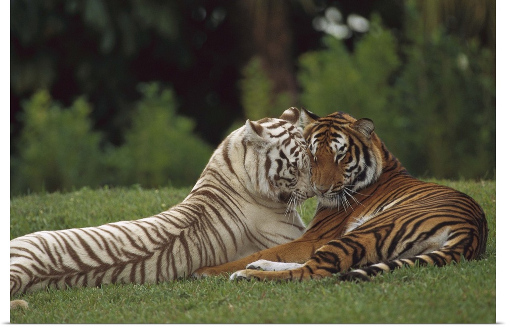 <p>Bengal Tiger (Panthera tigris tigris) affectionate pair, one with normal coloration and the other a melanistic white morph, India</p>