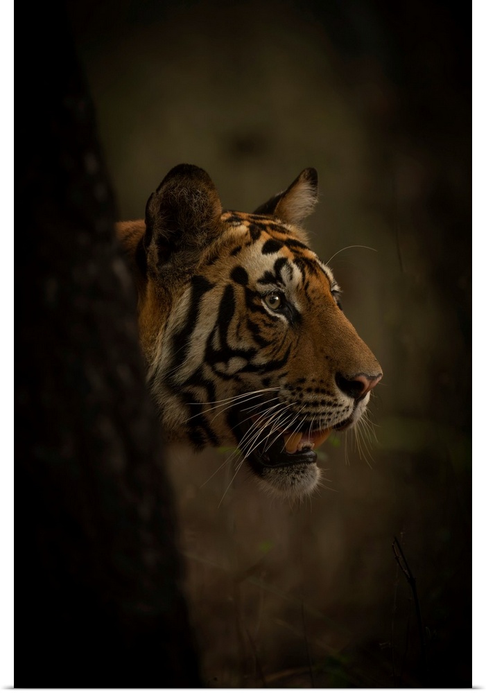 <p>Bengal tiger (Panthera tigris tigris) pokes its head past a tree in a forest, letting its mouth hang open. It has orange, black and white stripes on its head; Madhya Pradesh, India</p>