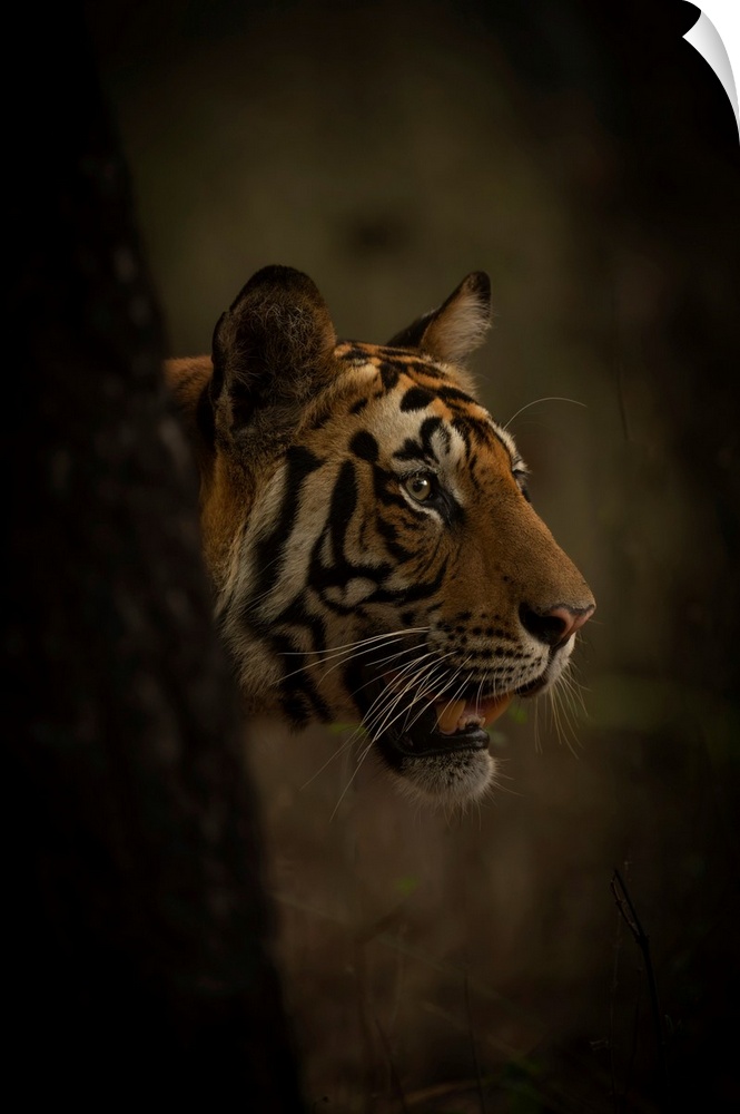 <p>Bengal tiger (Panthera tigris tigris) pokes its head past a tree in a forest, letting its mouth hang open. It has orange, black and white stripes on its head; Madhya Pradesh, India</p>