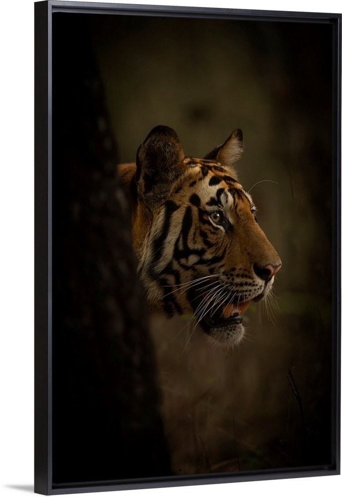 <p>Bengal tiger (Panthera tigris tigris) pokes its head past a tree in a forest, letting its mouth hang open. It has orange, black and white stripes on its head; Madhya Pradesh, India</p>
