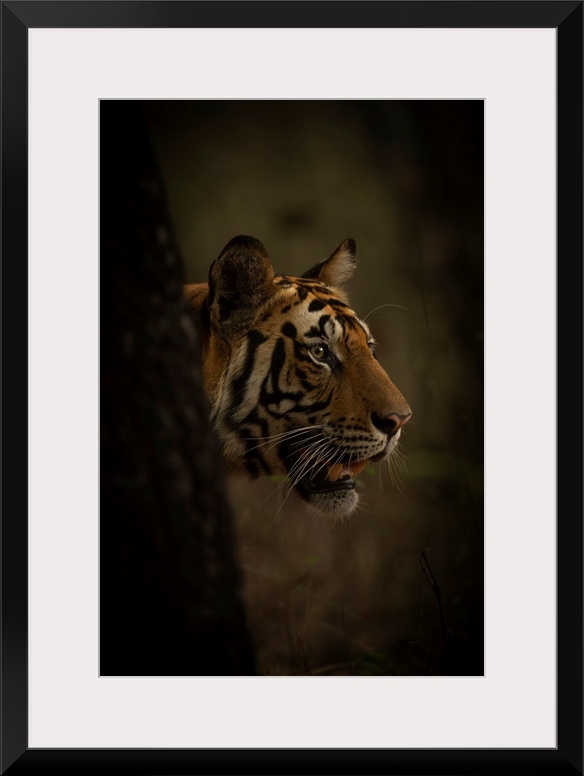 <p>Bengal tiger (Panthera tigris tigris) pokes its head past a tree in a forest, letting its mouth hang open. It has orange, black and white stripes on its head; Madhya Pradesh, India</p>