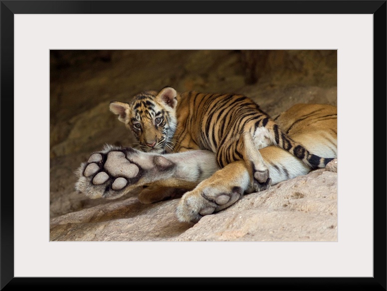 <p>Bengal Tiger.Panthera tigris .6 week old cub on mother at den.Bandhavgarh National Park, India.*Digitally removed branch in foreground........</p>