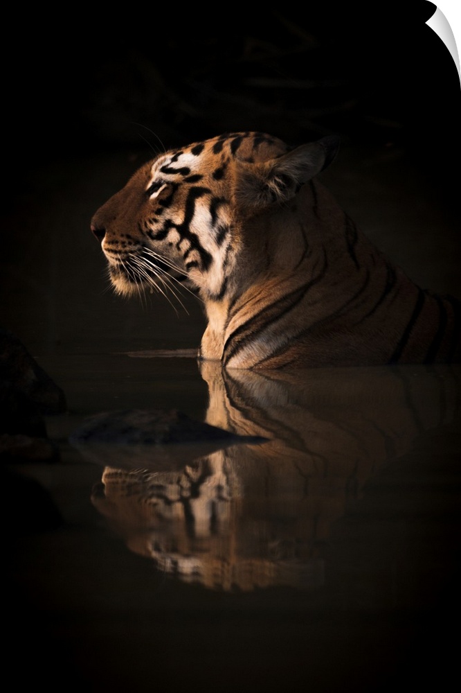 <p>A Bengal tigress (Panthera tigris tigris) lies up to her neck in the dark shadows of a water hole. Her name is Maya 'The Enchantress', and she has orange and black stripes with white patches on her head; India</p>