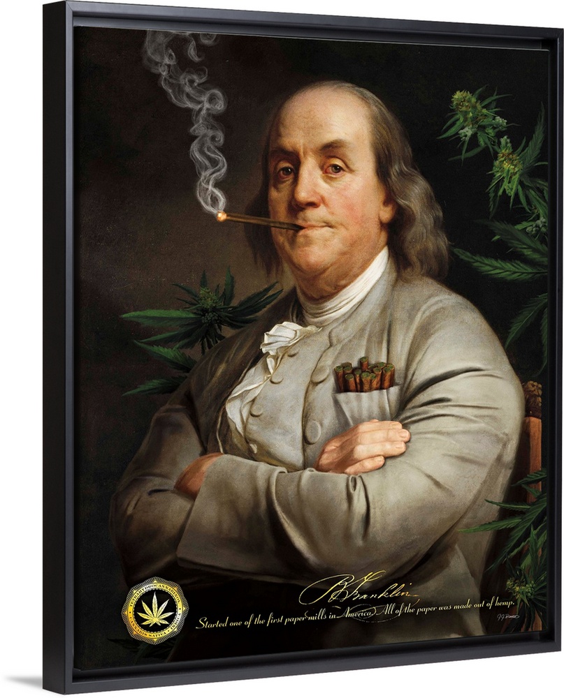 <p>Digital art painting of a poster titled Ben's Cigar by JJ Brando. Ben Franklin surrounded by marijuana plants.</p>