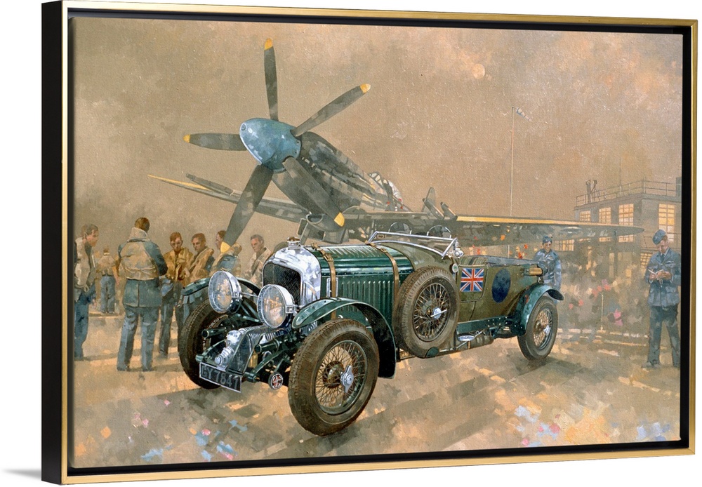 <p>Painting of vintage car and aircraft surrounded by British soldiers.</p>