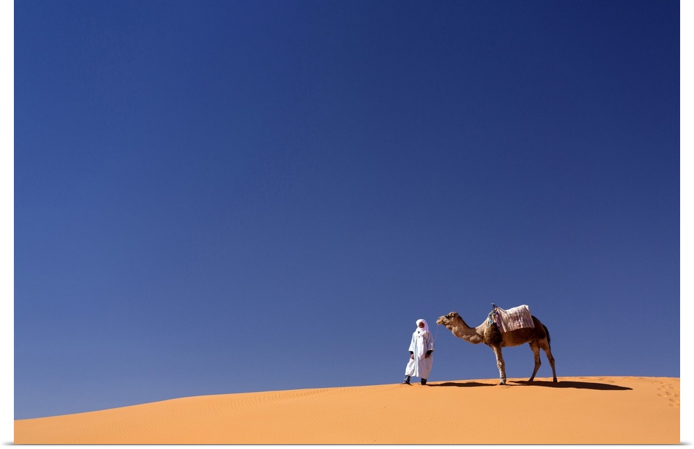 <p>Berber man with camel on the ridge of an orange sand dune in the Erg Chebbi sand sea, Sahara Desert near Merzouga, Morocco, North Africa, Africa</p>