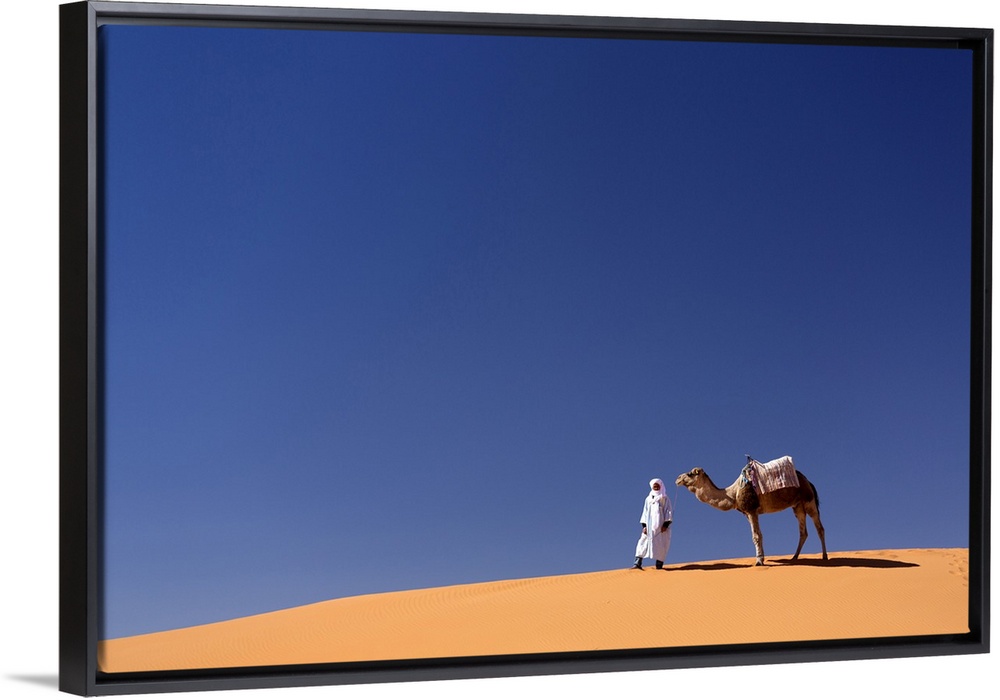 <p>Berber man with camel on the ridge of an orange sand dune in the Erg Chebbi sand sea, Sahara Desert near Merzouga, Morocco, North Africa, Africa</p>