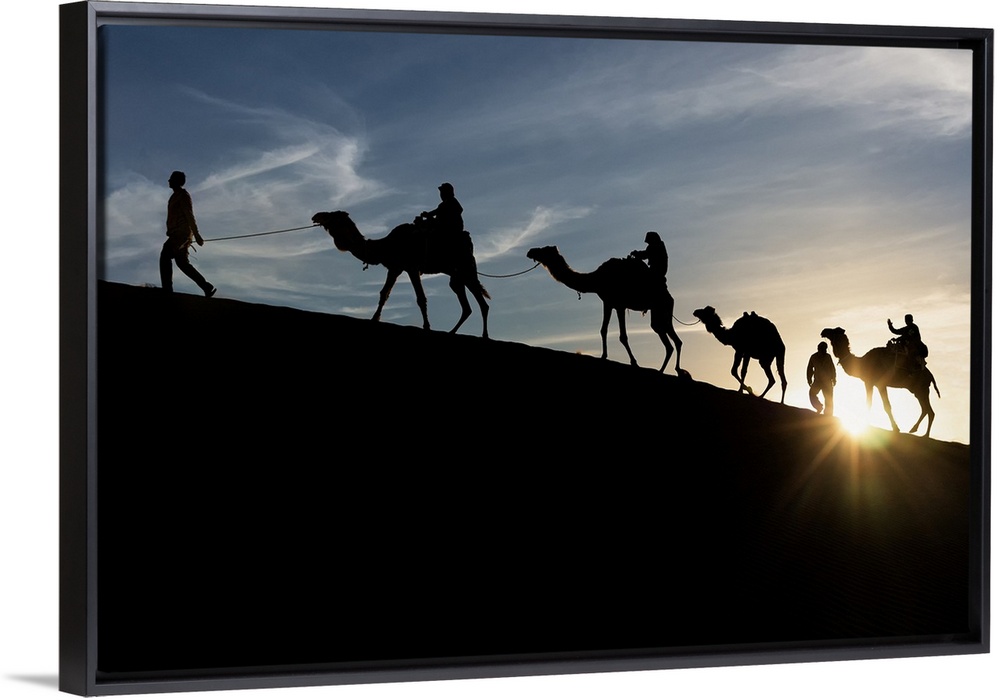 <p>Berber Silohuette at the sunstet in the sand dunes with dromedary, Sahara desert, Tunisia, Northern Africa.</p>