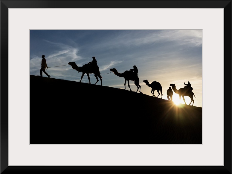 <p>Berber Silohuette at the sunstet in the sand dunes with dromedary, Sahara desert, Tunisia, Northern Africa.</p>