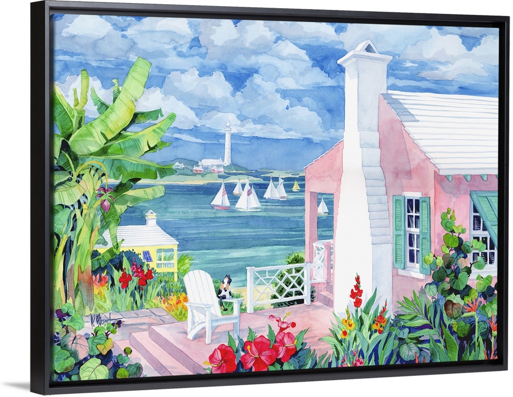 <p>Watercolor painting of a Bermuda resort town.</p>