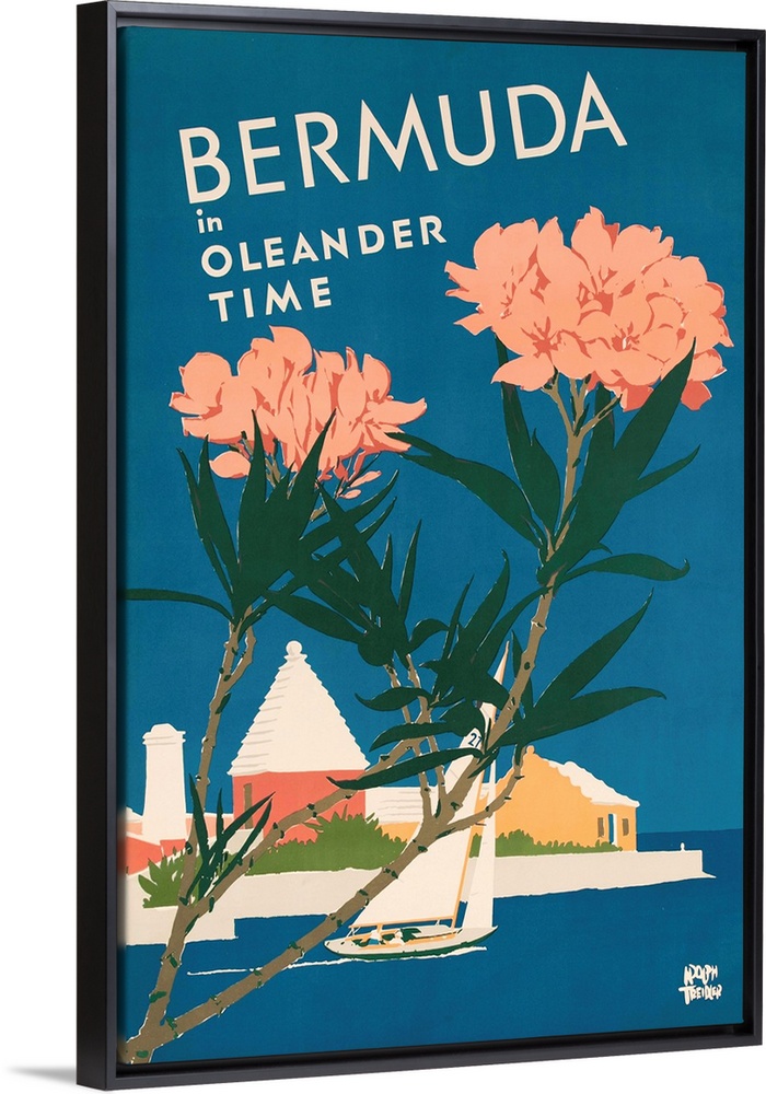 <p>Bermuda travel poster showing sailboat in front of typical architecture with flowering Oleanders in the foreground, illustrated by Adolph Treidler ca 1950s</p>
